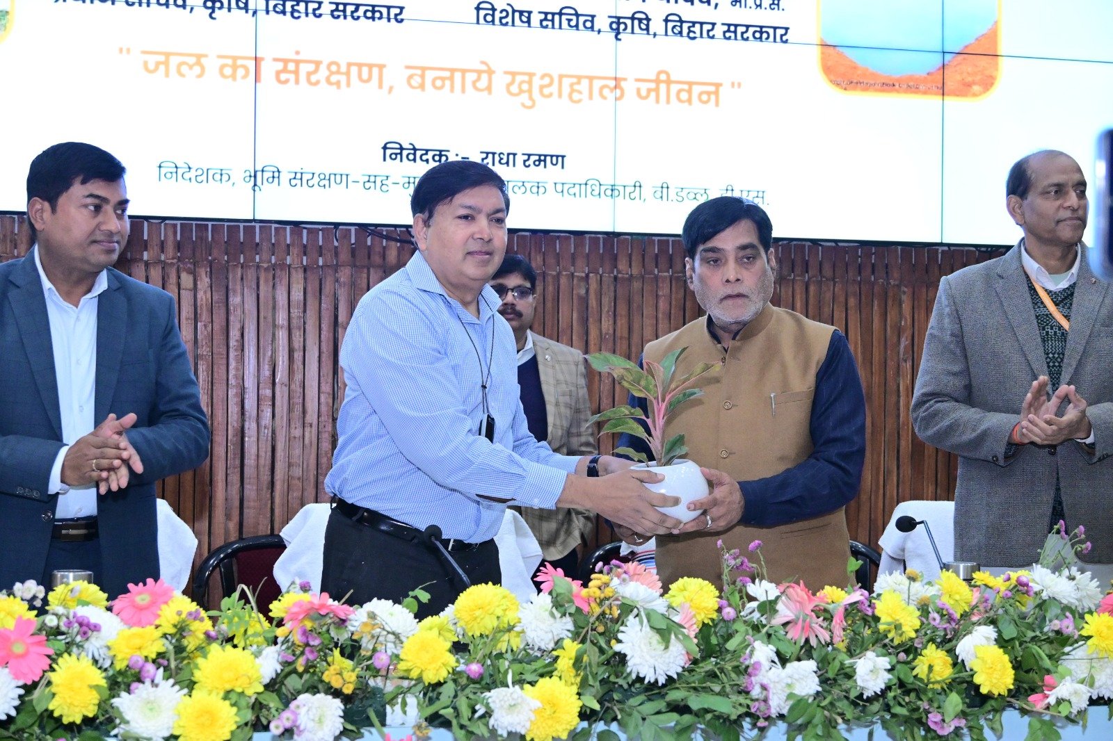 پانی کا ذخیرہ، پانی کا تحفظ اور زمین کا تحفظ صدیوں سے ہماری طرز زندگی کا حصہ رہے ہیں۔انہوں نے بتایا کہ وزیر اعظم نریندر مودی کی رہنمائی اور وزیر اعلیٰ نتیش کمار کی قیادت میں محکمہ زراعت کے لینڈ کنزرویشن ڈائریکٹوریٹ کی جانب سے پردھان منتری کرشی سنچائی یوجنا واٹر شیڈ ڈیولپمنٹ کمپوننٹ 2.0 کے تحت جنوبی بہار کے 17 اضلاع اور شمالی بہار کے بیگو سرائے کو ملا کر کل 18 بارانی اضلاع میں 35 منصوبوں پر عمل درآمد کیا جا رہا ہے۔ اس پانچ سالہ منصوبے کے لیے حکومت ہند نے 440 کروڑ روپے منظور کیے ہیں۔ اس کے تحت 496 ہیکٹر میں شجرکاری، 282 پکے چیک ڈیم، 62 کھیت تالاب، 361 پانی ذخیرہ کرنے والے تالاب، 756 آہر-پین کی مرمت اور 344 کنوؤں کی تعمیر و مرمت کی گئی ہے۔ نئے مالی سال میں پی ایم کے ایس وائی 3.0 کا آغاز ہوگا۔وزیر موصوف نے کہا کہ بہار میں تقریباً 9 لاکھ ہیکٹر زمین مٹی کے کٹاؤ سے متاثر ہے۔ اسے روکنے کے لیے ‘جل-جیون-ہ ہریالی ‘ مشن کے ذریعے تالابوں، آہر-پین کی کھدائی، تزئین و آرائش، شجرکاری اور آبی ذخائر کو تجاوزات سے پاک کیا گیا ہے۔ گنگا کے پانی کو پائپ لائن کے ذریعے نالندہ، راجگیر، گیا اور نوادہ تک پہنچانا پانی کے انتظام کی بہترین مثال ہے۔انہوں نے بتایا کہ دنیا کا تقریباً 4 فیصد میٹھا پانی بھارت میں دستیاب ہے، جس میں سے 80 فیصد پانی زراعت میں استعمال ہوتا ہے۔ اس لیے زراعت کے لیے پانی کا سائنسی انتظام انتہائی ضروری ہے۔ وزیر اعظم کے ’’فور آر‘‘ (ریڈیوس، ری یوز، ریچارج اور ریسائیکل) اور ’’پر ڈراپ مور کراپ‘‘ مہم سے پانی کے تحفظ کو نئی سمت ملی ہے۔وزیر موصوف نے نوجوانوں اور جیویکا دیدیوں سے اپیل کی کہ وہ عوامی شراکت داری کے ذریعے پانی کے ذخیرہ اور تحفظ کو عوامی تحریک بنائیں۔ انہوں نے کہا، ’’جل محفوظ تو ملک محفوظ۔‘‘