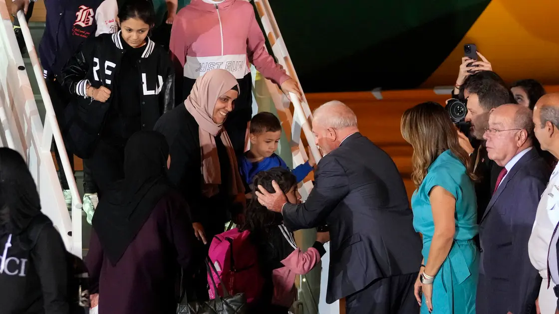 برازیل کے شہری اور ان کے اہل خانہ جو غزہ کی پٹی میں تھے، برازیل کے صدر لوئیز اناسیو لولا دا سلوا نے پیر، 13 نومبر، 2023 کو برازیلیا، برازیل میں ایئر بیس پہنچنے پر، نیچے دائیں طرف، استقبال کیا۔ (اے پی)
