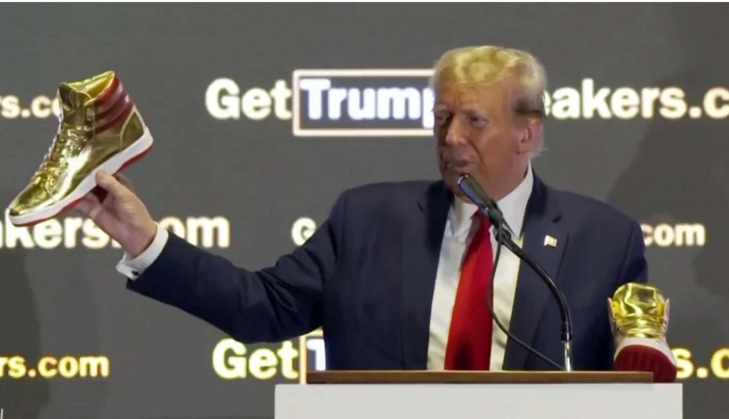 سابق صدر نے فلاڈیلفیا میں ایک تقریب کے وران اپنے نئے جوتے ’ٹرمپ اسنیکرز‘ کی نقاب کشائی کی۔ میڈیا رپورٹس کے مطابق انہوں نے سنہری رنگ کے جوتے کا ایک جوڑا اسٹیج پر رکھا، ایک ویب سائٹ کے مطابق اس کی قیمت 399 ڈالر ہے اور اسے ’نیور سرینڈر ہائی ٹاپ اسنیکر‘ کا نام دیا گیا ہے۔