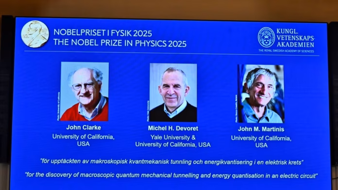 سویڈین، 7 اکتوبر:۔ (ایجنسی) ان دنوں نوبل پرائز کا سیزن جاری ہے اور ہر روز دنیا ایک نئی سائنسی پیش رفت کا جشن منا رہی ہے۔ کل 6 اکتوبر کو طب کے شعبے میں نوبل انعام دیا گیا۔ آج 7 اکتوبر 2025 کو فزکس کی باری تھی۔ کل، 8 اکتوبر، 2025، کیمسٹری کے فاتحین کا اعلان کیا جائے گا۔ آج کا فزکس کا نوبل انعام ان سائنسدانوں کو دیا گیا جنہوں نے یہ ثابت کیا کہ کوانٹم فزکس صرف ایک خوردبین کے ذریعے نظر آنے والی چیز نہیں ہے بلکہ اس کے عجائبات ہینڈ ہیلڈ سرکٹس میں بھی دیکھے جا سکتے ہیں۔ آئیے آپ کو ان تینوں سائنسدانوں کے نام اور ان کے کام کے بارے میں بتاتے ہیں۔ اس سال فزکس کا نوبل انعام جیتنے والے تین سائنسدان جان کلارک، مشیل ایچ ڈیوریٹ اور جان ایم مارٹنیس ہیں۔ ان تینوں نے مل کر ایک تجربہ کیا جس میں سپر کنڈکٹنگ اجزاء سے ایک الیکٹرانک سرکٹ بنایا گیا، جس نے میکروسکوپک سطح پر کوانٹم میکینکس کے دو بڑے اثرات – سرنگ اور توانائی کی مقدار کو ظاہر کیا۔ آئیے اسے آسان الفاظ میں بیان کرتے ہیں۔