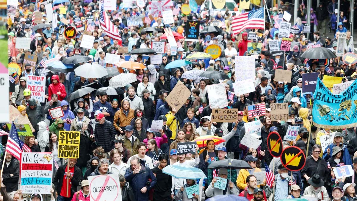 نیویارک، 15 جون (یو این آئی) : نیویارک میں مسلسل بارش کے باوجود ہزاروں شہریوں نے ٹرمپ انتظامیہ کی پالیسیوں کے خلاف شہر میں منعقدہ ملک گیر احتجاج میں شامل ہوئے۔ نیویارک بھر میں 90 سے زیادہ مقامات پر احتجاج کا منصوبہ بنایا گیا تھا، اور ملک بھر میں لاکھوں لوگوں کے "قومی یوم سول نافرمانی " میں شامل ہونے کی توقع ہے۔"نو کنگس" ویب سائٹ کے مطابق، ہفتہ کے روز ملک گیر احتجاج کا اہتمام "آمریت ، ارب پتی پر مرکوز سیاست اور جمہوریت کی عسکریت نوازی کو مسترد کرنے" کے لیے کیا گیا۔ نیویارک میں مین ہٹن، کوئنز، بروکلین اور اسٹاٹین آئی لینڈ میں متعدد مقامات پر احتجاجی مظاہرے ہوئے۔ ہزاروں مظاہرین برائنٹ پارک اور ففتھ ایونیو کے ارد گرد جمع ہوئے اور میڈیسن اسکوائر پارک کی طرف پرامن مارچ کیا۔مظاہرین نے ٹرمپ انتظامیہ کی مذمت کرتے ہوئے مختلف پلے کارڈ اٹھا رکھے تھے اور نعرے لگا رہے تھے۔ ان کی تختیوں پر یہ جملے لکھے تھے "ہم کیا چاہتے ہیں؟ کوئی آئی سی ای (یو ایس امیگریشن اینڈ کسٹمز انفورسمنٹ) نہیں!" ہم اسے کب چاہتے ہیں؟ ابھی!‘‘ ’’ انصاف نہيں، تو امن نہيں!‘‘ ’’کوئی ملک بدری منظور نہیں!‘‘