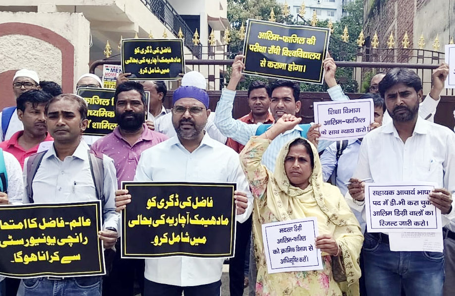 جبکہ اس سے قبل مڈل اسکولوں اور ہائی اسکولوں میں اردو اساتذہ کی اسامیاں پر کی گئی ہیں۔اسی طرح ڈائریکٹوریٹ آف سیکنڈری ایجوکیشن نے بھی ثانوی آچاریہ اردو کے عہدوں پر بھرتی میں پوسٹ گریجویٹ کے مساوی فاضل تربیت یافتہ امیدواروں کو شامل نہیں کیا، جے اے سی نے عالم فاضل کا امتحان دینے سے انکار کردیا لیکن محکمہ اعلیٰ تعلیم متبادل نظام کے تحت کسی بھی یونیورسٹی سے امتحان نہیں لے رہا۔موقع پر ہی اقلیتی کمیشن کے نائب صدر شمشیر عالم نے ڈائرکٹر پرائمری ایجوکیشن کو فون کرکے معاملے کو حل کرنے کی ہدایت دی، جس پر ڈائرکٹر نے کہا کہ مدرسہ کی ڈگری کے سلسلے میں جے ایس ایس سی سے رائے لینے کا حکم دیا گیا ہے، جلد ہی اسسٹنٹ آچاریہ زبان کے عہدوں پر عالم کے تربیت یافتہ امیدواروں کا نتیجہ جاری کیا جائے گا۔شمشیر عالم نے کہا کہ مدرسہ کی ڈگری سے متعلق معاملات سے جلد وزیر اعلیٰ کو آگاہ کیا جائے گا۔ اس موقع پر محمد وسیم، نصرت جہاں، حفیظ الرحمن، محمد عبداللہ،انوارالحق، عظیم الدین انصاری، ضیاءالحق،شمس الحق، خورشید عالم، آفتاب صدیقی، محفوظ عالم، صبا کریم، افتخار عالم اور دیگر کی بڑی تعداد موجود تھی۔