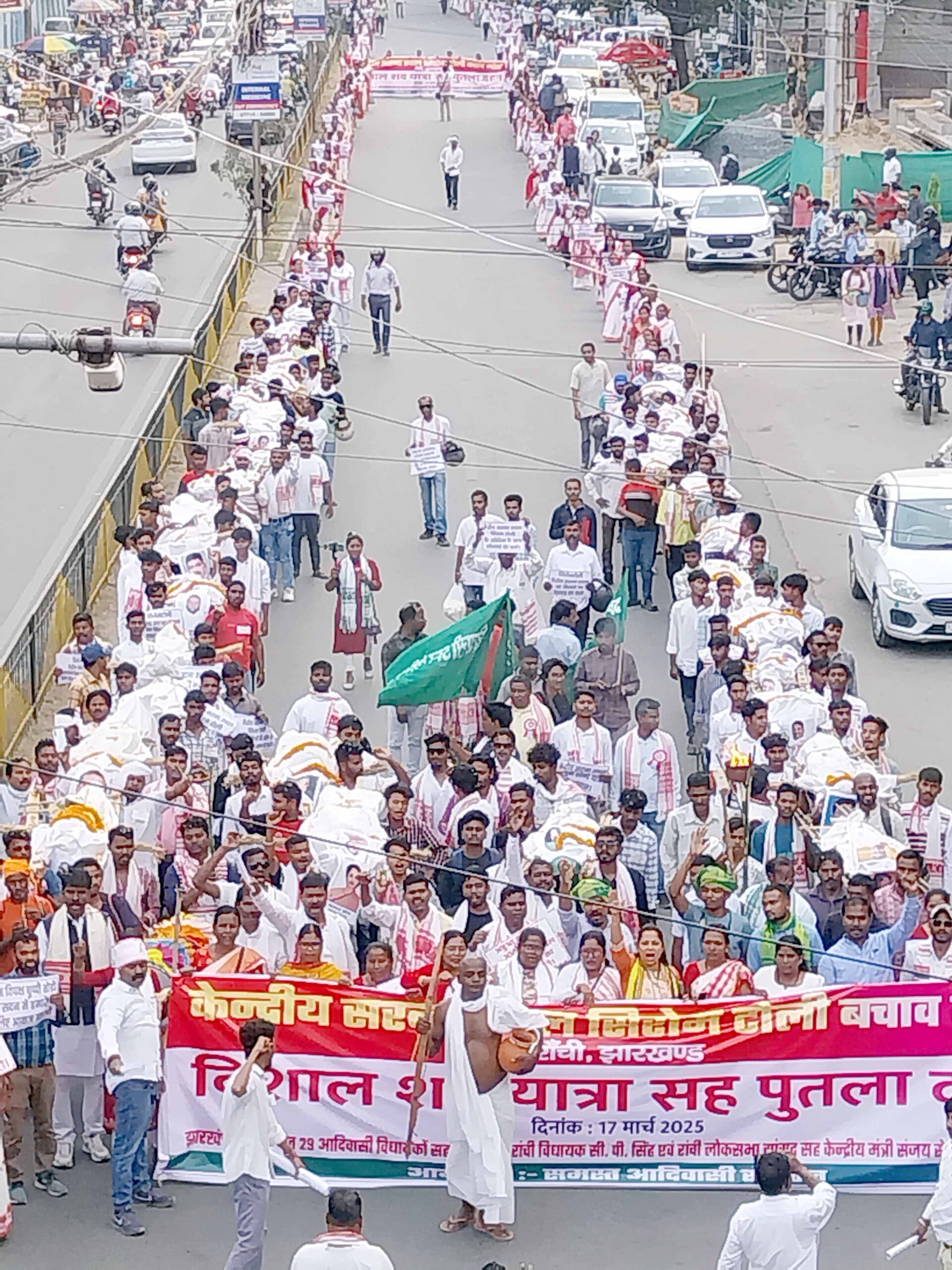 رانچی17 مارچ: راجدھانی رانچی میں میکان گیٹ سے لیکر سیرم ٹولی چوک تک تعمیر کیئےگئے نئے فلائی اوور کے سرنا استھل سیرم ٹولی کے نزدیک بنائے گئے ریمپ کو ہٹانے کے مطالبہ کو لیکر سیاست تیز ہوتی جارہی ہے۔ بی جے پی حامی آدیباسی تنظیموں کے ذریعہ آج بطور احتجاج رانچی میں سیرم ٹولی چوک اور ارگوڑا چوک سے شہید الرٹ ایکا چوک تک معدد ممبران اسمبلی کی شو یاترا نکالی گئی۔ احتجاج میں شامل لوگ وزیر اعلیٰ، سابق وزیر اعلیٰ چمپئی سورین اور با بولان مرانڈی سمیت معدد ممبران اسمبلی کے پتلوں کا جنازہ اٹھائے ہوئے چل رہے تھے۔ اس احتجاججی شو یاترا میں بڑی تعداد میں خواتین بھی شامل تھیں۔ احتجاج کرنے والوں کا کہنا ہے کہ سیرم ٹولی چوک پر آدیباسیوں کا سب سے بڑا قدیم سرنا استھل قائم ہے۔ جس کی جگہ پر فلائی اوور کے ریمپکی تعمیر کر دی گئی ہےاسے یہاں پر تعمیر نہ کرنے کیلئے کافی پہلے سے احتجاج کیا جارہاہے اس بابت حکومت اور وزیر اعلیٰ تک بھی بات پہچائی جا چکی ہے، وزیر اعلیٰ نے یقین دہائی بھی کرائی تھی کہ سرم ٹولی سیرم استھل کے سامنے سے فلائی اوور کا ریمپ ہٹادیا جائےگا لیکن اس کے لئے اب تک کوئی قدم نہیں اٹھایا گیاہے اس احتجاجی جلوس کی قیادت کرنے والوںمیں پریم شاہی منڈا بھی شامل تھے۔جن کے بارے میں عام طور پر کہا جاتا ہے وہ بی جے پی کے بیحد قریبی ہیں۔