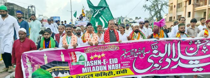 رانچی:- سرکار کی آمدمرحبا، رسول کی آمد مرحبا، محسن کی آمد مرحبا، لبیک یارسول اللہ کے فلک شگاف نعروں سے جھارکھنڈ کی راجدھانی شہررانچی کی فضالگاتار کئ ایک گھنٹوں تک گونجتی رہی اور جب ایک ساتھ لاکھوں فرزندان توحیدورسالت نے جشن عیدمیلادالنبی صلی اللہ علیہ وسلم مناتے ہوے بیک زبان عشق کی زبان سے نعروں کی گونج ہوئ تو ایسا محسوس ہو رہا تھا کہ خالق کائنات اپنے لاکھوں فرشتوں کے ذریعہ رحمت وفضیلت کی برسات فرمارہاتھا، موقع تھا بارہ ربیع الاول شریف 1447 ہجری دن جمعہ بعد نمازجمعہ عیدمیلادالنبی صلیکللہ علیہ وسلم کے مبارک موقع سے ادارہ شرعیہ جھارکھنڈ کی سرپرستی، سنی بریلوی سنٹرل کمیٹی کے اھتمام اور علماء اہل سنت کی قیادت میں نہایت عقیدت واحترام کے ساتھ رانچی میں نکالے گئے تاریخ ساز جلوس عیدمیلادالنبی صلی اللہ علیہ وسلم کا، جاری شیڈول کے مطابق 5/ ستمبر2025 کو بعد نماز جمعہ شہرواطراف سے شان وشوکت کے ساتھ ہرمحلوں، انجمن، مکتب، مدرسہ، تنظیم، پنچایت، کلب، مساجد اور سمیتیوں کی جانب سے جلوس نکالاگیاجو اپنے متعینہ شاہراہوں سے گزرتاہواساڑھے تین بجے کربلاچوک پہونچااور پھر ٹکسی اسٹینڈ، اردولائبریری، ہوتے ہوے اقرامسجد کے پاس پہنچ کر ایک گھنٹہ تقریری پروگرام ہواجس میں لاکھوں مجمع سے خطاب کرتے ہوے ادارہ شرعیہ جھارکھنڈکے ناظم اعلی مولانامحمدقطب الدین رضوی نے کہاکہ پوری کائینات کو حضور صلی اللہ علیہ وسلم کے صدقے ہی میں اللہ تعالی نے وجودبخشا اور خود پروردگارا فرماتاہے کہ جوبھی نعمتیں رب کی طرف سے دی گئیں ہیں وہ محمدمصطفی کے صدقے میں اس لیئے محمدرسول اللہ صلی اللہ علیہ وسلم کی آمد اور یوم ولادت باسعادت کو خوب دھوم دھام سے مناؤ، ناظم اعلی نے سیرت رسول کے حوالے سے خطاب فرماتے ہوے کہاکہ محسن اعظم رسول اکرم جناب محمدرسول اللہ صلی اللہ علیہ وسلم کے فرمودات پر عمل پیراہوکرہی تمام تر کامیابی ،کامرانی اور ترقی کے منازل طے کیئے جاسکتے ہیں انہوں نے اقوام عالم سے کہاکہ حضور اکرم صلی اللہ علیہ وسلم پوری دنیا اور ہرقوم، چرندپرند سب کے لیئے نبئ رحمت بناکر اس دنیامیں بھیجے گئے اس لیئے اقوام عالم کو سیرت رسول اکرم اسوہ حسنہ کاعامل بن جانا چاہیئے،