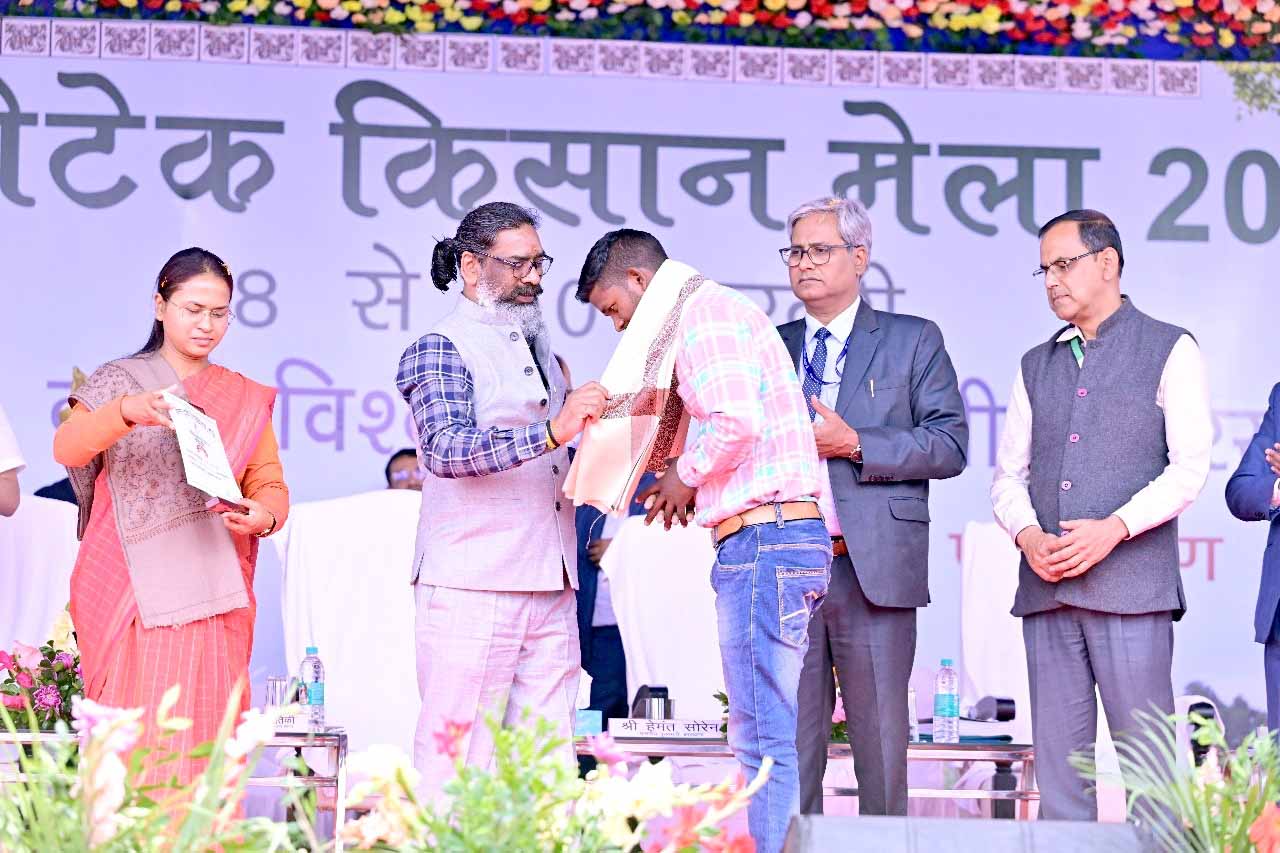 رانچی، 8 فروری:۔ برسا زرعی یونیورسٹی میں ’ یگروٹیک کسان میلہ -2025‘کا انعقاد کیا گیا ہے۔ اس میں جھارکھنڈ کے کسانوں، کاشتکار خواتین اور زرعی مصنوعات پر مبنی نوجوان کاروباریوں کو جدید زراعت، مویشی پالن، جنگلات، ڈیری، بائیو ٹیکنالوجی، زرعی میکانائزیشن، فوڈ پروسیسنگ – ویلیو ایڈیشن تکنیک کے ساتھ ساتھ گھریلو اور کاٹیج سے متعلق جدید تکنیکوں کے بارے میں معلومات فراہم کی جائیں گی۔ یہ میلہ 8 سے 10 فروری تک جاری رہے گا۔ وزیر اعلیٰ ہیمنت سورین نے آج سنیچر کے روز برسا زرعی یونیورسٹی میں تین روزہ ایگروٹیک میلے 2025 کا افتتاح کیا۔ اس دوران وزیر اعلیٰ نے بی اے یو کے روزنامہ اور دیگر اشاعتوں کا اجرا کیا۔ وزیر اعلیٰ اور وزیر زراعت نے ریاست کے مختلف اضلاع کے ترقی پسند کسانوں کو اعزاز سے نوازا۔ شیوچرن بیدیا کو قدرتی کاشتکاری کے لیے، سریتا دیوی کو باجرے کی کاشت کے لیے اور افضل میاں کو پاکور کے لیے اعزاز سے نوازا گیا۔