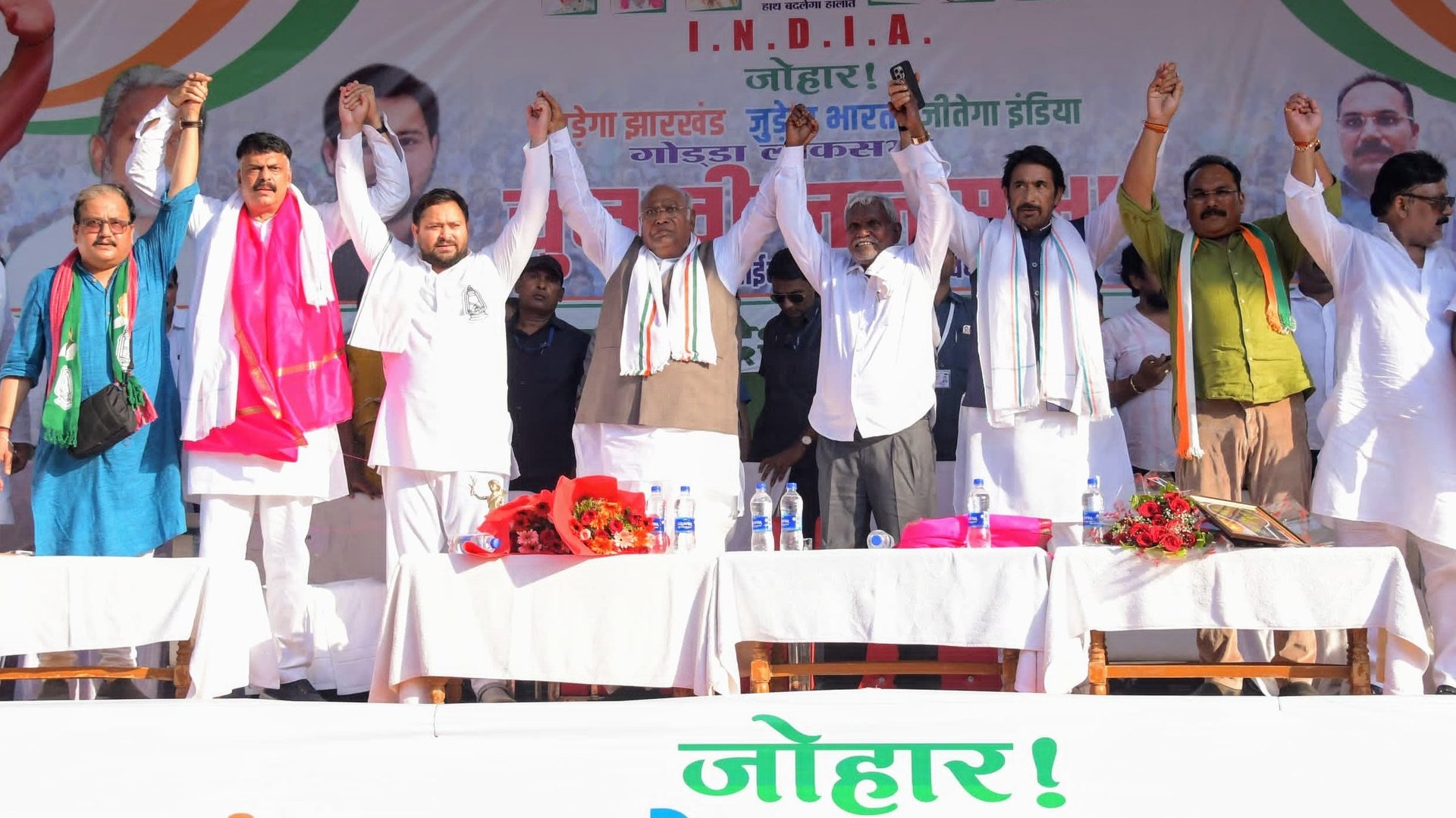 اس موقع پر کانگریس صدر کھڑگے نے کہا کہ ’’ہندوستان میں ایک ہی قبائلی وزیر اعلیٰ ہیمنت سورین تھے۔ انتخاب کے وقت انھیں جیل میں ڈال دیا گیا۔ اس کا بدلہ جھارکھنڈ کی عوام ضرور لے گی۔‘‘ انھوں نے مزید کہا کہ ’’رام مندر کی پران پرتشٹھا کے وقت صدر جمہوریہ دروپدی مرمو کو مدعو نہیں کیا گیا کیونکہ وہ قبائلی ہیں۔ پارلیمنٹ ہاؤس کے سنگ بنیاد کے وقت رام ناتھ کووند کو بھی نہیں بلایا گیا۔ یہ دلتوں سے مودی حکومت کے نفرت کو ظاہر کرتا ہے۔‘‘