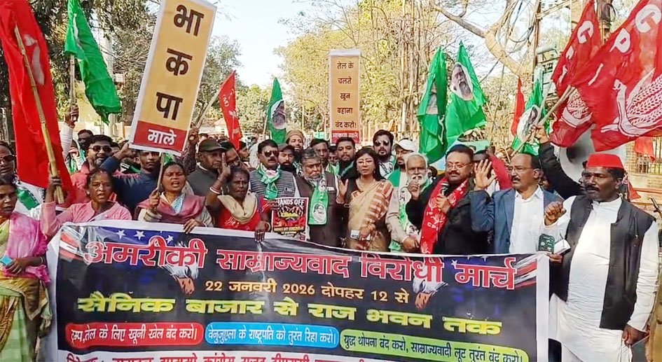 رانچی،22؍جنوری: عالمی فیڈریشن آف ٹریڈ یونینز (WFTU) کی کال پر امریکی سامراج کی جانب سے وینزویلا کی خودمختاری پر حملوں، اغوا، پابندیوں اور جنگی پالیسیوں کے خلاف رانچی میں ایک بڑا احتجاجی مارچ نکالاگیا۔ ‘ورلڈ اینٹی امپیریلزم ڈے‘ کے تحت منعقدہ اس مارچ کی قیادت جھارکھند مکتی مورچہ (JMM) کے ضلع کنوینر مشتاق عالم، سی پی آئی کے اجے سنگھ اور دیگر بائیں بازو کی جماعتوں کے رہنماؤں نے مشترکہ طور پر کی۔ رانچی کے سینک بازار سے شروع ہونے والایہ مارچ مین روڈ سے ہوتا ہوا لوک بھون پہنچا، جہاں یہ ایک عوامی جلسے میں تبدیل ہو گیا۔ پورے راستے میں مظاہرین ‘امریکی سامراج مردہ باد‘ اور ‘صدر نکولس مادورو اور ان کی اہلیہ کو رہا کرو‘ کے نعرے لگا رہے تھے۔