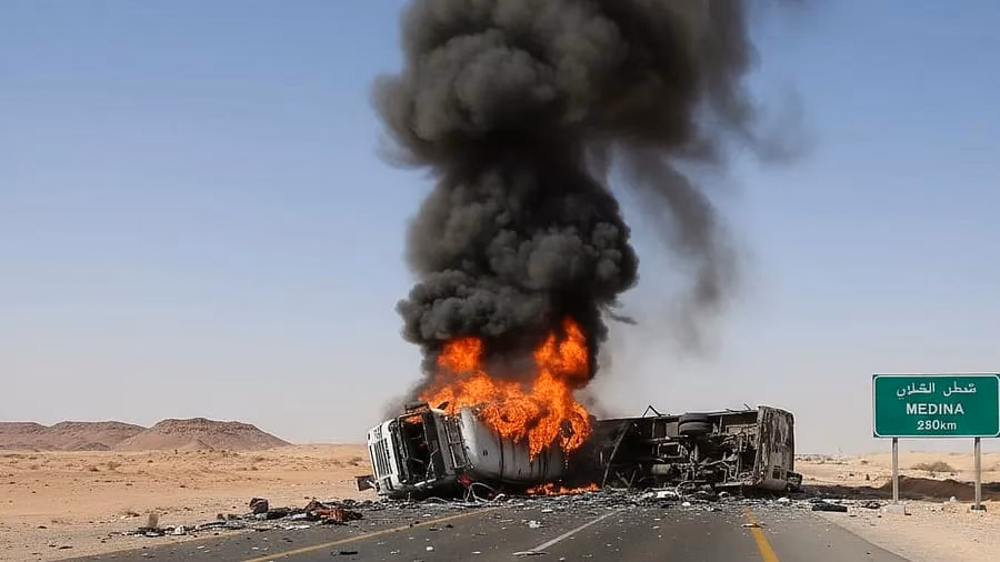 المدینہ المنورہ: سعودی عرب میں ایک بڑا Bus Accident پیش آیا۔ ایک تیز رفتار Diesel Tanker نے عمرہ زائرین کی بس کو ٹکر مار دی۔ بس میں آگ لگ گئی اور 45 Indian Pilgrims موقع پر جان سے گئے۔ زیادہ تر افراد کا تعلق Hyderabad اور Telangana سے تھا۔