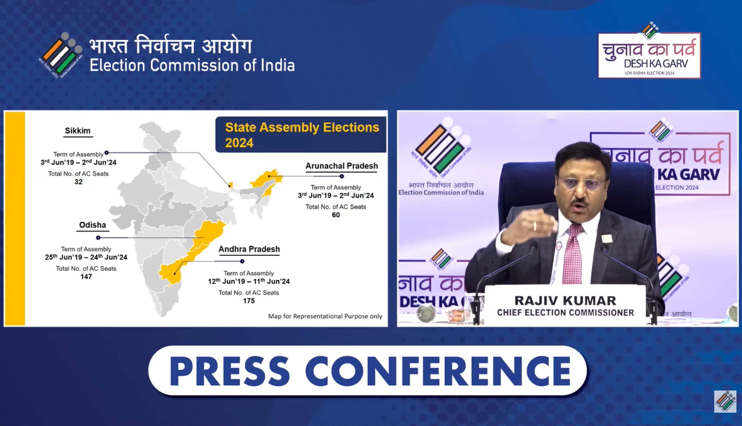 پریس کانفرنس کے دوران چیف الیکشن کمشنر نے اطلاع دی کہ اوڈیشہ میں پولنگ چار مراحل میں ہوگی جبکہ دیگر تین ریاستوں سکم، اروناچل پردیش اور آندھرا پردیش میں پولنگ ایک ایک مرحلہ میں مکمل ہوگی۔ سکیم اور اروناچل پردیش میں ووٹنگ 19 اپریل کو، آندھرا پردیش 13 مئی کو، جبکہ اڈیشہ میں 13 مئی، 20 مئی اور 25 مئی کو ہوگی۔