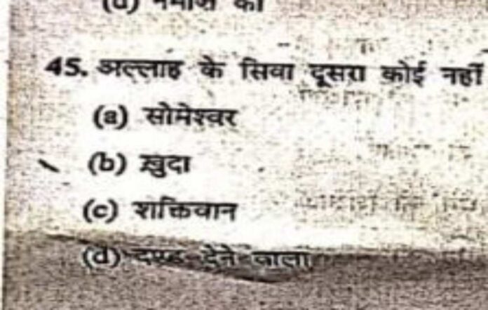 اجین، 9 اپریل:۔ مدھیہ پردیش کے اجین میں واقع سمراٹ وکرمادتیہ یونیورسٹی میں بی کام، بی سی اے اور بی بی اے کے امتحانات کے دوران پوچھے گئے ایک سوال پر ہنگامہ برپا ہو گیا۔ یونیورسٹی نے فوری کارروائی کرتے ہوئے سوالیہ پرچہ مرتب کرنے والے پروفیسر کو معاملے کی انکوائری مکمل ہونے تک معطل کر دیا ہے۔ اس کے علاوہ پروفیسر کو بلیک لسٹ کرنے کے لیے اقدامات شروع کیے جا رہے ہیں۔ یہ کارروائی 'ہندی کے پرچے میں پوچھے گئے " اللہ کے سوا دوسرا کوئی نہیں؟ سوال کے بعد کی گئی ہے۔