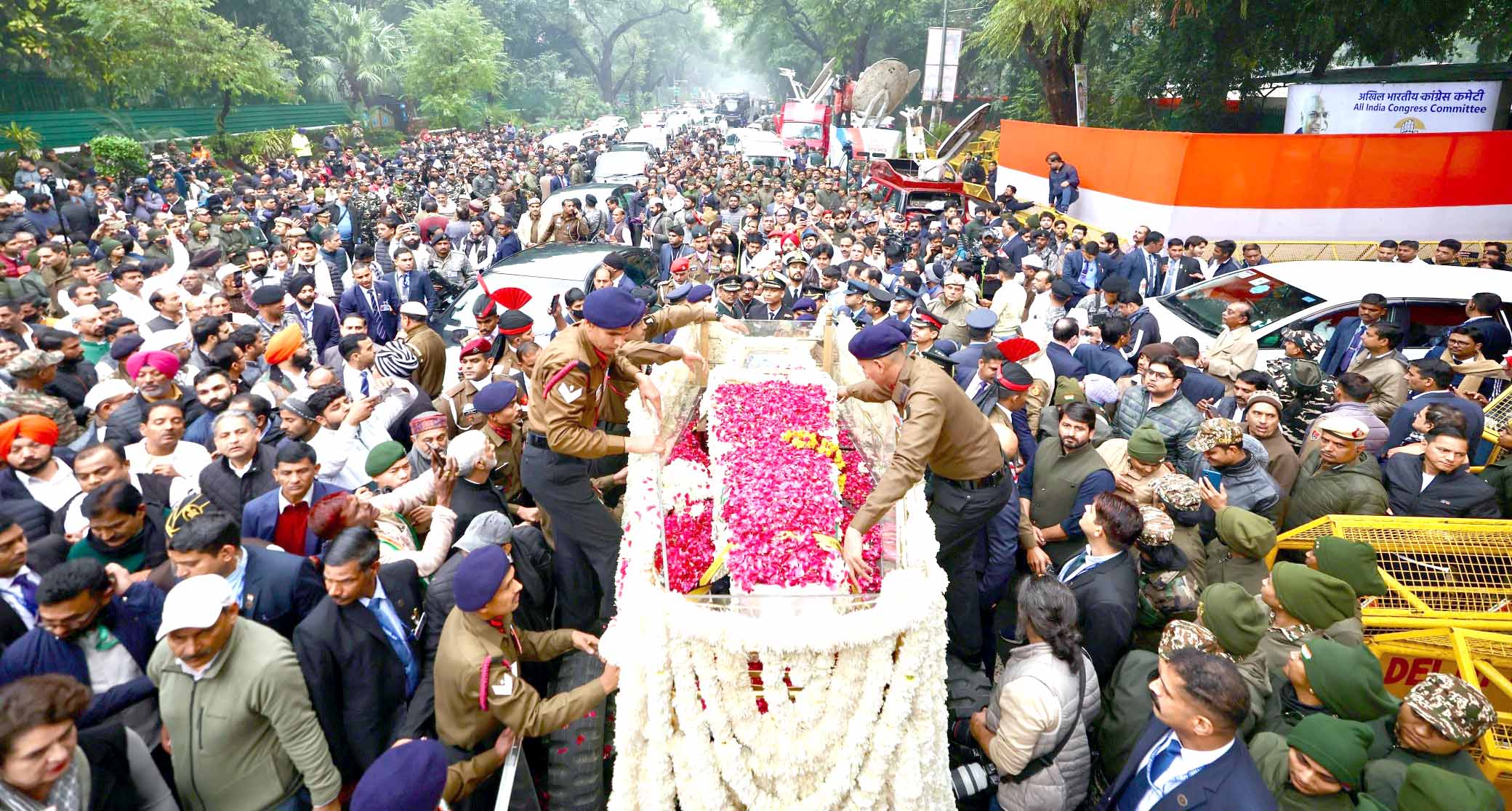 نئی دہلی، 28 دسمبر (یو این آئی) سابق وزیر اعظم ڈاکٹر منموہن سنگھ کے جسد خاکی کو خراج عقیدت پیش کرنے اور ان کے آخری دیدار کے لئے کانگریس ہیڈکوارٹر پر آج لوگوں کا ہجوم جمع ہوگیا ہے ڈاکٹر سنگھ کے جسد خاکی کو صبح ان کی رہائش گاہ سے کانگریس ہیڈکوارٹر لایا گیا جہاں کانگریس صدر ملکارجن کھڑگے، کانگریس پارلیمانی پارٹی کی لیڈر سونیا گاندھی، لوک سبھا میں اپوزیشن لیڈر راہل گاندھی، پارٹی جنرل سکریٹری پرینکا گاندھی واڈرا، کانگریس کے جنرل سکریٹری کے سی وینوگوپال سمیت کئی اہم لیڈروں نے سابق وزیر اعظم کا آخری دیدار کرتے ہوئے ان کو خراج عقیدت پیش کیا۔ خراب موسم کے باوجود کانگریس کارکنان پارٹی ہیڈکوارٹر پہنچے اور ڈاکٹر سنگھ کے آخری درشن کیے اور ان کے جسد خاکی پھول چڑھائے۔کانگریس ہیڈکوارٹر میں ڈاکٹر منموہن سنگھ کی اہلیہ گرو شرن کور اور ان کی بیٹی نے بھی سابق وزیر اعظم کے جسد خاکی پر پھول چڑھائے اور ان کا آخری دیدار کیا۔ڈاکٹر سنگھ کو گلہائے عقیدت پیش کرنے کے بعد ان کے جسد خاکی کو کانگریس ہیڈکوارٹر سے نگم بودھ گھاٹ لے جایا گیا جہاں سرکاری اعزاز کے ساتھ ان کی آخری رسومات ادا کی گئیں۔