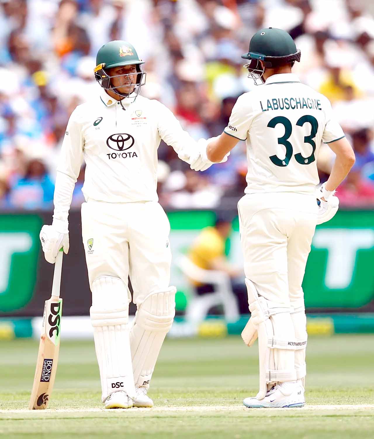 میلبورن، 26 دسمبر (یو این آئی) اسٹیو اسمتھ (ناٹ آؤٹ 68)، عثمان خواجہ (57)، سیم کونسٹاس (60) اور مارنس لیبوشین (72) کی نصف سنچریوں کی بدولت آسٹریلیا نے جمعرات کو چوتھے ٹیسٹ میچ میں پہلے دن کا کھیل ختم ہونے کے وقت چھ وکٹوں پر 311 رنز بنا کر میچ پراپنی گرفت بنالی ہے۔اس سے قبل آج یہاں آسٹریلیا کے کپتان پیٹ کمنز نے ٹاس جیت کر پہلے بلے بازی کرنے کا فیصلہ کیا۔ بلے بازی کرنے اتری عثمان خواجہ اور سیم کونسٹاس کی اوپننگ جوڑی نے عمدہ آغاز کیا اور پہلے وکٹ کے لیے 89 رنز کی شراکت کی۔ 20ویں اوور میں رویندرا جڈیجہ نے سیم کانسٹاس کو ایل بی ڈبلیو آؤٹ کرکے اس شراکت کو توڑا۔ کونسٹاس نے 65 گیندوں میں چھ چوکے اور دو چھکے لگاتے ہوئے ڈیبیو ٹیسٹ میں اپنی پہلی نصف سنچری اسکور کرتے ہوئے (60) رنوں کی اننگ کھیلی۔اس کے بعد بیٹنگ کے لیے آنے والے مارسن لیبوشگن نے عثمان خواجہ کے ساتھ مل کر محاذ سنبھالا۔ دونوں بلے بازوں کے درمیان دوسرے وکٹ کے لیے 65 رنز کی شراکت ہوئی۔ 45ویں اوور میں جسپریت بمراہ نے عثمان خواجہ کو کے ایل راہل کے ہاتھوں کیچ آؤٹ کروا کر اس شراکت کو توڑا۔ عثمان خواجہ نے 121 گیندوں میں چھ چوکے لگا کر (57) رنز بنائے۔ چائے کے وقت تک آسٹریلیانے 53 اوورز میں دو وکٹوں پر 176 رنز بنا لیے تھے۔ اس کے بعد واشنگٹن سندر نے مارسن لیبوشین کو کوہلی کے ہاتھوں کیچ آؤٹ کروا کر ہندوستان کو تیسری کامیابی دلائی۔ لیبوشگن نے 145 گیندوں میں سات چوکوں کی مدد سے (72) رنز بنائے۔ اگلے ہی اوور میں بمراہ نے ٹریوس ہیڈ (0) کو بولڈ کر کے پویلین بھیج دیا۔ اس کے بعد بمراہ نے مچل مارش (چار) کو بھی اپنا شکار بنالیا۔ آسٹریلیا کا چھٹا وکٹ ایلکس کیری (31) کی صورت میں گرا۔ انہیں آکاش دیپ نے آؤٹ کیا۔ دن کا کھیل ختم ہونے پر آسٹریلیا نے 86 اوورز میں چھ وکٹوں پر 311 رنز بنا لیے ہیں اور اسٹیو اسمتھ (68 ناٹ آؤٹ) اور کپتان پیٹ کمنز (آٹھ ناٹ آؤٹ) کریز پر موجود ہیں۔ ہندوستان کی جانب سے جسپریت بمراہ نے تین وکٹ لئے اور واشنگٹن سندر، رویندرا جڈیجہ اور آکاش دیپ نے ایک ایک بلے باز کو آؤٹ کیا۔