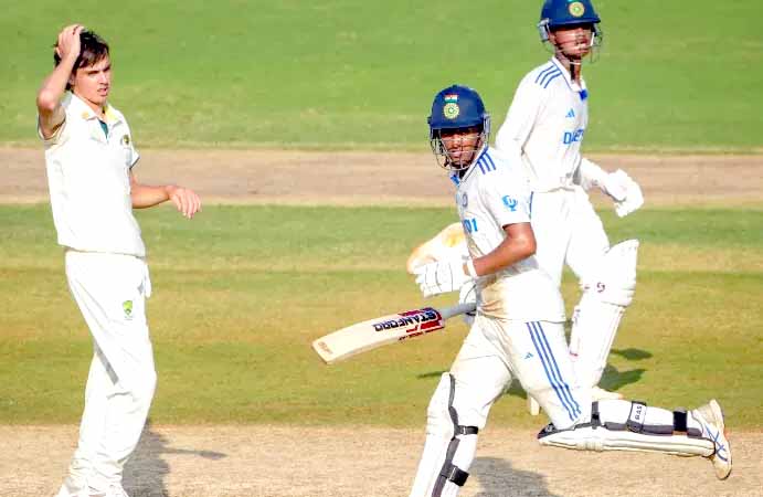 دو میچوں کی اس سیریز میں ہندوستانی ٹیم کو 1-0 کی برتری حاصل ہے۔دن کے کھیل کے اختتام پر کپتان سوہم پٹوردھن (ناٹ آؤٹ 61) اور ہرونش پنگالیا (سات) ناٹ آؤٹ رہے۔آسٹریلیا کی جانب سے ہیری ہوکسٹرا نے دو جبکہ پیٹرسن، ہاوے اور رام کمار نے ایک ایک وکٹ حاصل کی۔