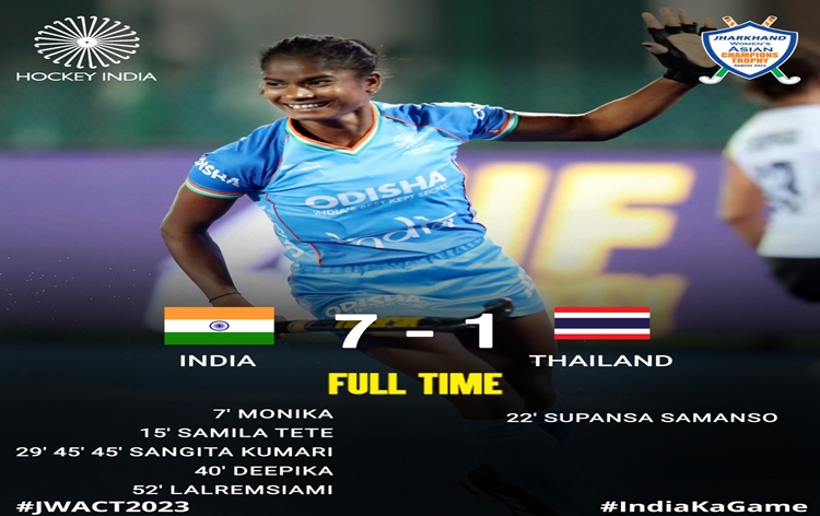 جھارکھنڈ کے رانچی میں خواتین کی ایشیائی ہاکی چمپئن شپ ٹرافی میں کل رات بھارت نے تھائی لینڈ کو اپنے پہلے میچ میں 7-1 سے شکست دی۔ سنگیتا کماری نے لگاتار تین گول کئے ، جبکہ مونیکا Salima Tete ، دیپکا اور Lalremsiami نے ایک ایک گول کئے اور بھارت کو جیت سے ہمکنار کیا۔ تھائی لینڈ کی Supansa Samanso نے واحد گول کیا۔