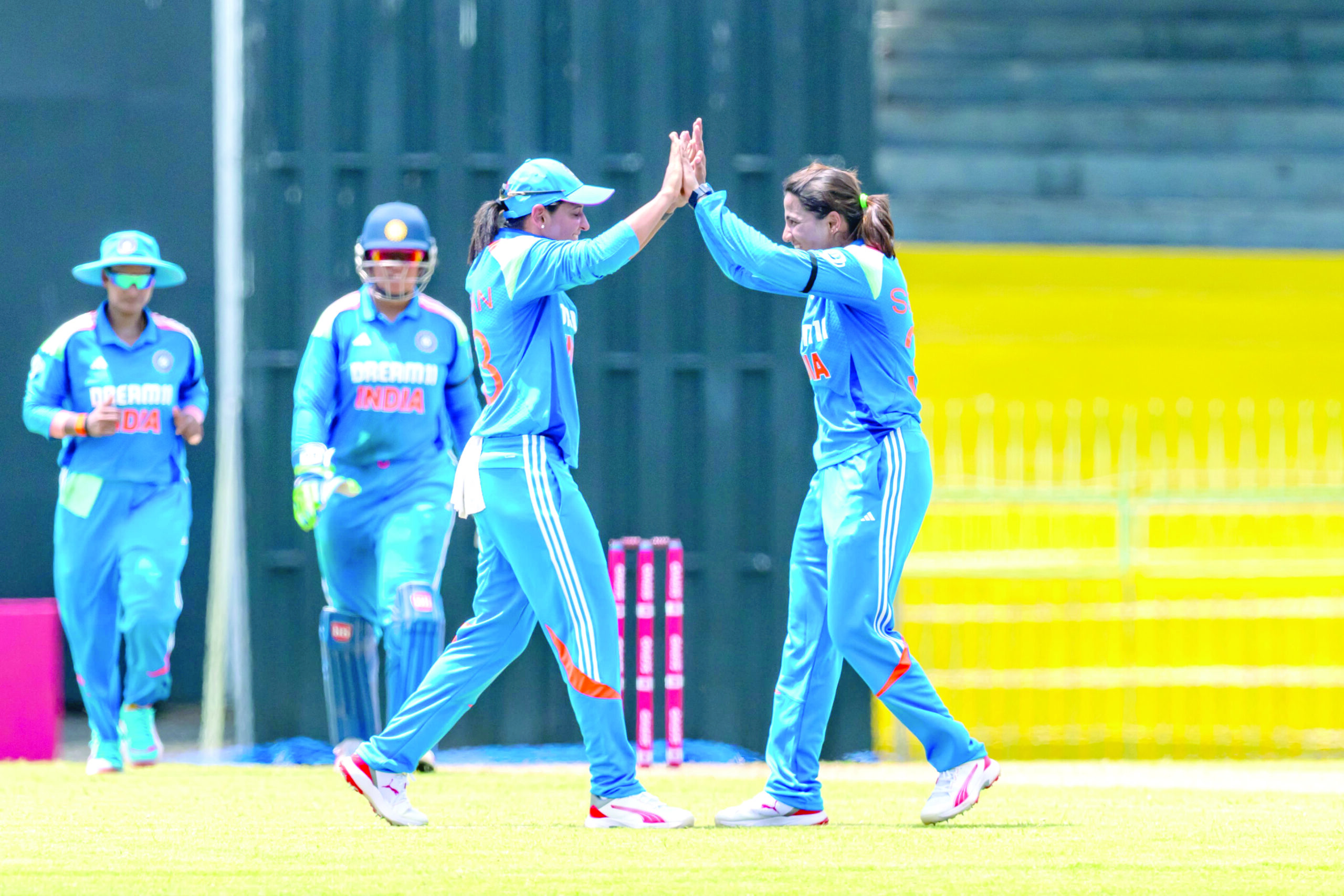 کولمبو، 27 اپریل (یو این آئی) اسنیہ رانا (تین وکٹ)، دیپتی شرما اور سری چرنی (دو وکٹ) کی شاندار گیندبازی کے بعد پرتیکا راول (ناٹ آؤٹ 50)، ہرلین دیول (48 ناٹ آؤٹ) اور اسمرتی مندھانا (43) کی شاندار بلے بازی نے ہندوستانی خواتین ٹیم نےبارش سے متاثر سہ روزہ سیریز کے پہلے یک روزہ مقابلے میں سری لنکا کو 56 گیندیں باقی رہتے نو وکٹ سے شکست دے دی۔148 رنز کے ہدف کے تعاقب میں ہندوستان نے پرتیکا راول اور اسمرتی مندھانا کی اوپننگ جوڑی کے ساتھ پہلی وکٹ کے لیے 54 رنز کی شراکت کے ساتھ اچھی شروعات کی۔ 10ویں اوور میں انوکا راناویرا نے نصف سنچری کی جانب گامزن اسمرتی مندھانا کو آؤٹ کر کے سری لنکا کو پہلی کامیابی فراہم کی۔ اسمرتی مندھانا نے 46 گیندوں میں چھ چوکوں کی مدد سے (43) رن بنائے۔ اس کے بعد ہرلین دیول بیٹنگ کے لیے آئیں اور پرتیکا راول کے ساتھ مل کر تحمل سے بیٹنگ کرتے ہوئے 29.4 اوورز میں ایک وکٹ کے نقصان پر 149 رنز بنا کر ہندوستانی ٹیم کو نو وکٹ سے فتح دلادی۔ پرتیکا راول نے 62 گیندوں پر سات چوکوں کی مدد سے ناٹ آؤٹ 50 رنز بنائے۔ جبکہ ہرلین دیول نے 71 گیندوں میں چار چوکوں کی مدد سے 48 رنز بنائے۔اس سے پہلے آج ہندوستانی خواتین ٹیم نے ٹاس جیت کر پہلے گیند بازی کرنے کا فیصلہ کیا۔ بارش کی وجہ سے اس ون ڈے میچ کو 39-39 اوورز تک محدود کر دیا گیا۔ سری لنکا کی بیٹنگ میں شروعات خراب رہی کیونکہ اس نے آٹھویں اوور میں کپتان چماری اتاپتو (سات) کو کھو دیا۔ وہ اروندھتی ریڈی کے ہاتھوں وکٹ کیپر رچا کے ہاتھوں کیچ آؤٹ ہوئیں۔ 14ویں اوور میں اسنیہ رانا نے ہسینی پریرا (30) کو ایل بی ڈبلیو آؤٹ کر کے سری لنکا کی دوسری وکٹ حاصل کی۔ سری لنکا کی تیسری وکٹ ہرشیتھا سماراویکراما (14) کے رن آؤٹ کے طور پر گری۔ ہنسیما کرونارتنے (چار) کو اسنیہ رانا نے اپنی ہی گیند پر کیچ لیا۔ نیلاکشی ڈی سلوا (10) کو بھی رانا نے اپنی ہی گیند پر کیچ لیا۔ کاویشا دلہری (25) اور پیومی بدلاج (2) کو سری چرنی نے آؤٹ کیا۔
