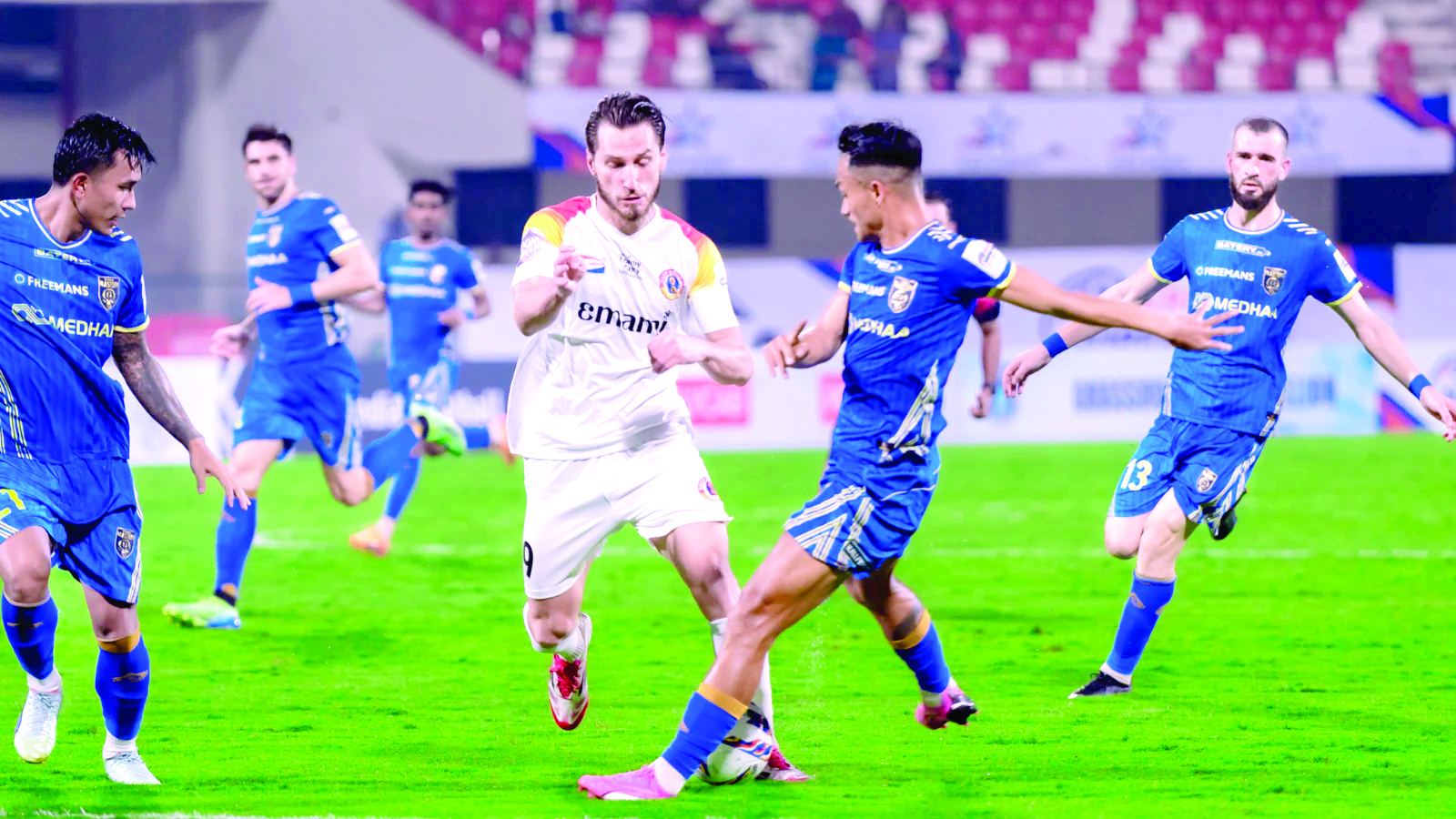 بھونیشور، 21 اپریل (یو این آئی) کیرالہ بلاسٹرز ایف سی نے دفاعی چیمپئن ایسٹ بنگال ایف سی کو 0-2سے شکست دے کر کلنگا سپر کپ 2025 کے کوارٹر فائنل میں داخلہ حاصل کر لیا۔کلنگا اسٹیڈیم میں اتوار کی رات کھیلے گئے راؤنڈ آف 16 کے میچ میں کیرالہ بلاسٹرز نے ہسپانوی اسٹرائیکر جیسز جمنیز کے گول کی بدولت 0-1کی برتری حاصل کی۔ اس کے بعد مراکش کے نوح ولی صداوی نے 64ویں منٹ میں گول کرکے اسکور 0-2کردیا۔ نوح ولی صدوای کو پلیئر آف دی میچ کا ایوارڈ دیا گیا۔26 اپریل کو کوارٹر فائنل میں کیرالہ بلاسٹرز کا مقابلہ موہن بگان ایس جی سے ہوگا۔