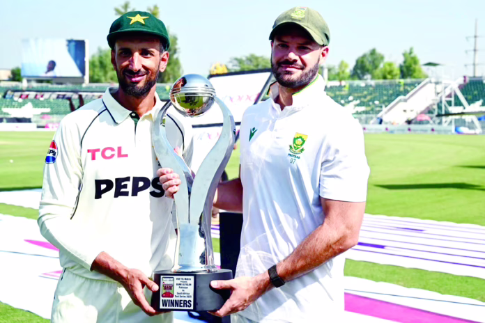 راولپنڈی، 23 اکتوبر (ہ س)۔ جنوبی افریقہ نے راولپنڈی ٹیسٹ میں پاکستان کو آٹھ وکٹوں سے شکست دے کر دو میچوں کی سیریز 1-1 سے برابر کر دی۔ اسپن جوڑی کیشو مہاراج اور سائمن ہارمر نے شاندار بولنگ کرتے ہوئے میزبان ٹیم کو ہتھیار ڈالنے پر مجبور کردیا۔ مہاراج نے میچ میں کل 9 وکٹیں (9/136) حاصل کیں، جبکہ ہارمر نے 8 وکٹیں (8/125) حاصل کیں۔ 68 رن کے چھوٹے ہدف کے تعاقب میں ایڈن مارکرم اور ریان رکلٹن نے ٹیم کو آسان فتح سے ہمکنار کیا۔ پاکستان نے پہلی اننگز میں 333 رن بنائے تھے جس کے جواب میں جنوبی افریقہ نے اپنی پہلی اننگز میں 404 رن بنا کر 71 رن کی برتری حاصل کر لی تھی۔ چوتھے دن پاکستان کی امیدوں پر پانی پھر گیا: چوتھے دن کے آغاز پر پاکستان کا سکور 94/4 تھا، کپتان بابر اعظم 49 رن پر کریز پر تھے۔ وہ اپنی ففٹی تک پہنچ گئے، لیکن صرف چند گیندوں بعد سائمن ہارمر نے انہیں ایل بی ڈبلیو کر دیا، جس سے میزبان ٹیم کو بڑا دھچکا لگا۔ اس کے بعد پاکستان کی اننگز تباہ ہوگئی۔ محمد رضوان شارٹ لیگ پر کیچ آؤٹ ہوئے، جس سے ہارمر کو اننگز کی پانچویں وکٹ ملی۔ تھوڑی دیر بعد، نعمان علی نے بھی وکٹ کیپر کی طرف بڑھتے ہوئے ہارمر کو اپنی 1000 فرسٹ کلاس وکٹ دی۔ شاہین آفریدی مسلسل تیسری بار صفر پر رن آؤٹ ہوئے۔ سلمان علی آغا نے ایک سوئپ اور ایک ریورس سوئپ کے ساتھ دو چوکے لگائے لیکن وہ بھی کیشو مہاراج کے ہاتھوں بولڈ ہوگئے۔ اس کے بعد مہاراج نے ساجد خان کو سٹمپ کیا، جس سے پاکستان کی اننگز 138 پر ختم ہوئی۔ مارکرم اور رکلٹن نے آسان جیت حاصل کی۔ ہدف کا تعاقب کرتے ہوئے ایڈن مارکرم نے شاندار بلے بازی کرتے ہوئے نعمان علی، ساجد خان اور آصف آفریدی کی اسپن تینوں کے چاروں طرف باؤنڈریز لگائے۔ مارکرم 42 رن بنا کر ایل بی ڈبلیو آؤٹ ہوئے جبکہ ٹرسٹن اسٹبس سلپ میں کیچ آؤٹ ہوئے۔ آخر میں، ریان رکلٹن (25)* نے براہ راست چھکا لگا کر جنوبی افریقہ کو یادگار فتح دلائی۔