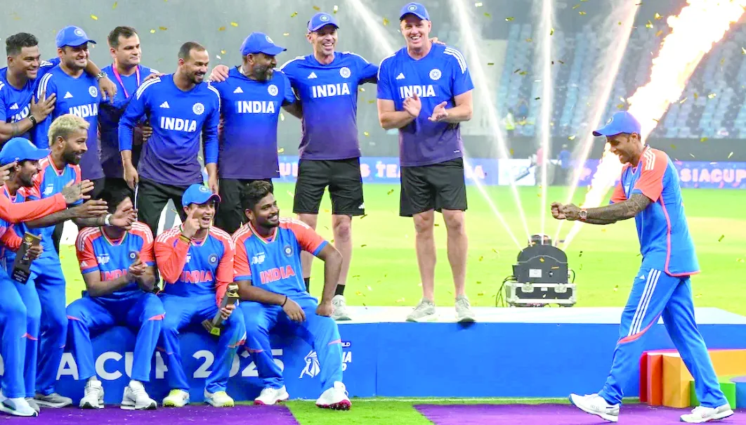 اس لیے یہاں میچ کے بعد ایوارڈز کی تقریب منعقد کی جائے گی۔تقریب کے اختتام اور نقوی کے جانے کے بعد، ہندوستانی ٹیم کے کھلاڑیوں نے تصویر لینے کے لیے ‘چیمپیئنز سائن بورڈ کو مختصراً باہر لایا لیکن پھر اسے ہٹا دیا۔ کھلاڑی اسٹیج پر بیٹھ گئے، کیمروں کے لیے پوز کیا اور پھر اس پر چڑھ گئے۔ مسکراتے ہوئے، سوریہ کمار نے ایک خیالی ٹرافی اٹھانے کا ڈرامہ کیا جبکہ ان کے ساتھی ساتھی اس کے ارد گرد تالیاں بجا رہے تھے۔میچ کے بعد پریس کانفرنس میں سوریہ کمار نے کہا کہ ہندوستان شاندار کارکردگی کے بعد ٹرافی جیتنے کا حقدار ہے۔ سوریہ کمار نے کہا جب سے میں نے کرکٹ کھیلنا اور دیکھنا شروع کیا ہے، میں نے کبھی کسی چیمپئن ٹیم کو ٹرافی سے انکار کرتے نہیں دیکھا۔ ہم نے اسے جیتنے کے لیے سخت محنت کی۔ ہم 4 ستمبر سے یہاں آئے ہیں، لگاتار دو اچھے میچ کھیل رہے ہیں۔ مجھے لگتا ہے کہ ہم اس کے مستحق تھے۔ میں اس سے زیادہ نہیں کہہ سکتا۔ مجھے لگتا ہے کہ میں نے اس کا اظہار بہت اچھے طریقے سے کیا ہے، میں اس سے زیادہ کچھ نہیں کہہ سکتا۔”ہندسوتان کی پانچ وکٹوں سے جیت کے فوراً بعد، بورڈ آف کنٹرول فار کرکٹ ان انڈیا (BCCI) نے بھی کھلاڑیوں اور معاون عملے کے لیے 21 کروڑ روپے کے انعامات کا اعلان کیا۔